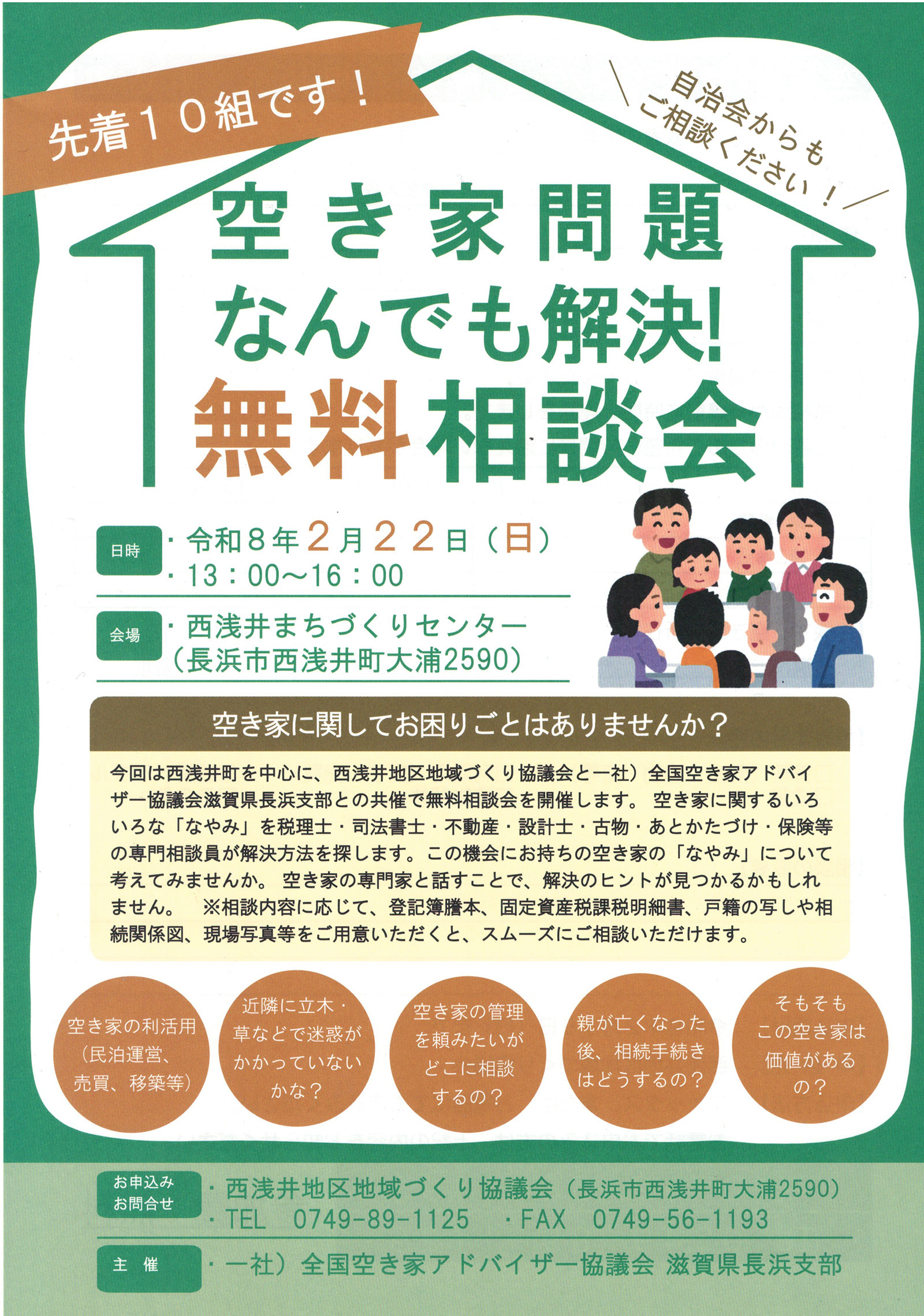令和8年2月22日、西浅井まちづくりセンターにて「空き家問題なんでも解決!無料相談会」を開催します。ふるってご参加ください。